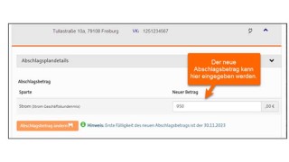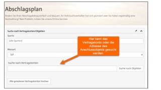 Hier kann das Vertragskonto oder das Anschlussobjekt gesucht und ein neuer Abschlagsbetrag eingetragen werden. Sie erhalten eine schriftliche Bestätigung.