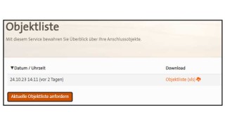 Unter Produkte & Verträge kann unter Objektliste einmal täglich eine Objektliste angefordert werden. Die Objektliste wird direkt aus der Datenbank generiert. Je nach Umfang (Anzahl Lieferstellen) Ihrer Verträge kann das einige Minuten dauern. Sie erhalten eine E-Mail, sobald die Liste im Portal zum Download zur Verfügung steht. Entsprechend generierte Listen finden Sie dann im Portal unter Ob-jektliste: