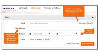 Das gesuchte Dokument kann nachfolgend in der Übersicht heruntergeladen werden. Sollten zu viele Dokumente angezeigt werden, kann man unter „Dokumente suchen“ die Vertragskontonummer eingeben oder den Dokumententyp auswählen, um die Anzeige zu reduzieren.