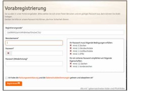 Unter Profil > Zugangsdaten Ändern kann der Benutzername (mindestens 5 Zeichen) oder das Passwort (Bedingungen siehe Screenshot Vorabregistrierung) geändert werden.