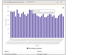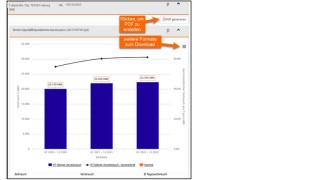 Die genauen Verbrauchswerte je Zeitraum sind in der Grafik ersichtlich, wenn man den Cursor auf die blauen Balken führt. Unter der Grafik befindet sich auch eine Tabelle mit Werten, die, wie im vorangegangenen Bild dargestellt, als PDF oder in anderen Formaten heruntergeladen werden kann.