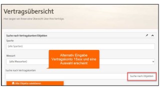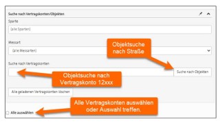 In der Suchmaske kann wie in den zuvor gezeigten Suchmasken ein Vertragskonto oder eine Adresse gesucht werden. Es können auch mehrere Stellen selektiert werden.