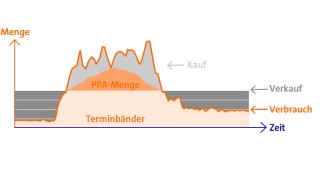 Zusätzlich zur Teilnahme am Spot-Markt können Sie Energiemengen über ein Power-Purchase-Agreement (PPA) sowie über Terminbänder stabilisieren. Mengenabweichungen vom PPA und Terminband zum tatsächlichen Energiebezug werden zu aktuellen Marktpreisen abgerechnet.