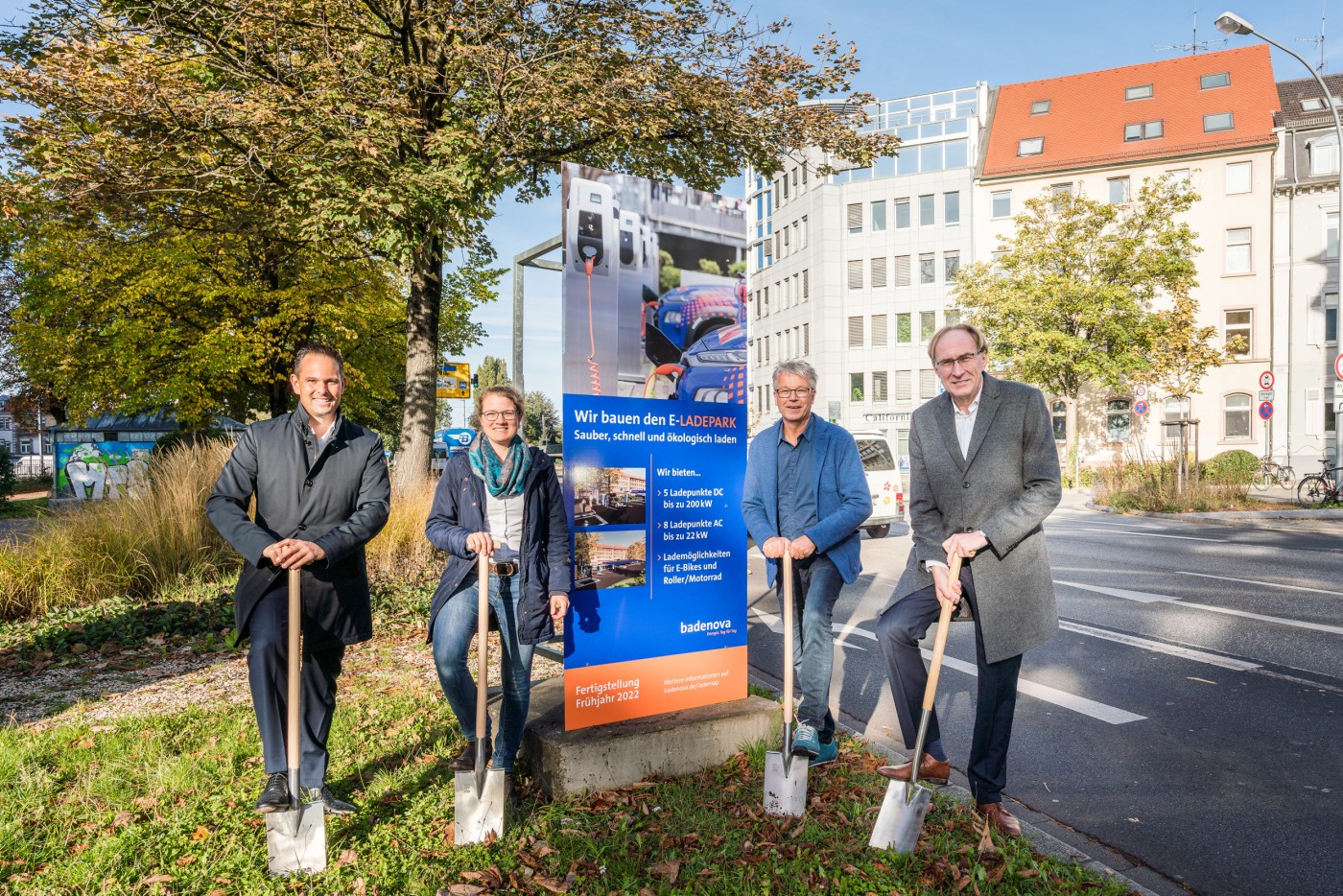 Eine erfreuliche Nachricht für E-Mobilisten aus der Region und Durchreisende: Im Herzen von Freiburg, an der B31/ Schreiberstraße nahe des Cafés „Extrablatt“, baut der regionale Energie- und Umweltdienstleister badenova einen Ultraschnellladepark für Elektrofahrzeuge. badenova Vorstand Hans-Martin Hellebrand, Freiburgs Baubürgermeister Prof. Martin Haag, Heiko Rüppel von Green Power Mobility und E-Mobilitätsleiterin bei badenova Dr. Susanne Baumgartner trafen sich zum offiziellen Spatenstich.
