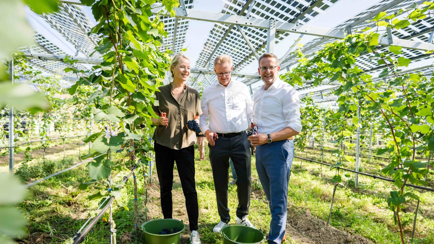 Auch der Wein profitiert von der Doppelnutzung der landwirtschaftlichen Flächen. Durch den Bau der Photovoltaikanlage über den Rebstöcken können die Trauben vor Umwelteinflüssen wie Frost, Hagel, Starkregen und Sonnenbrand geschützt werden. So kann auch der Erntezeitpunkt verzögert werden, sodass die Ernte zu einer kühleren Jahreszeit stattfinden und somit die Arbeitsbedingungen der Winzer verbessert werden.