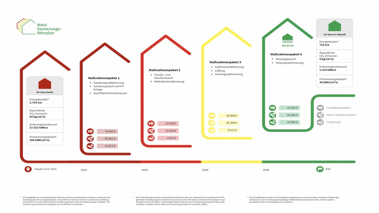 Ein iSFP hilft dabei, langfristige Auswirkungen von Sanierungsmaßnahmen zu berechnen, etwa finanzielle Einsparungen. Die intuitive Gestaltung des Sanierungsfahrplans und die ausführliche persönliche Beratung machen dabei die komplexe Welt der energetischen Sanierung leicht verständlich und nachvollziehbar.