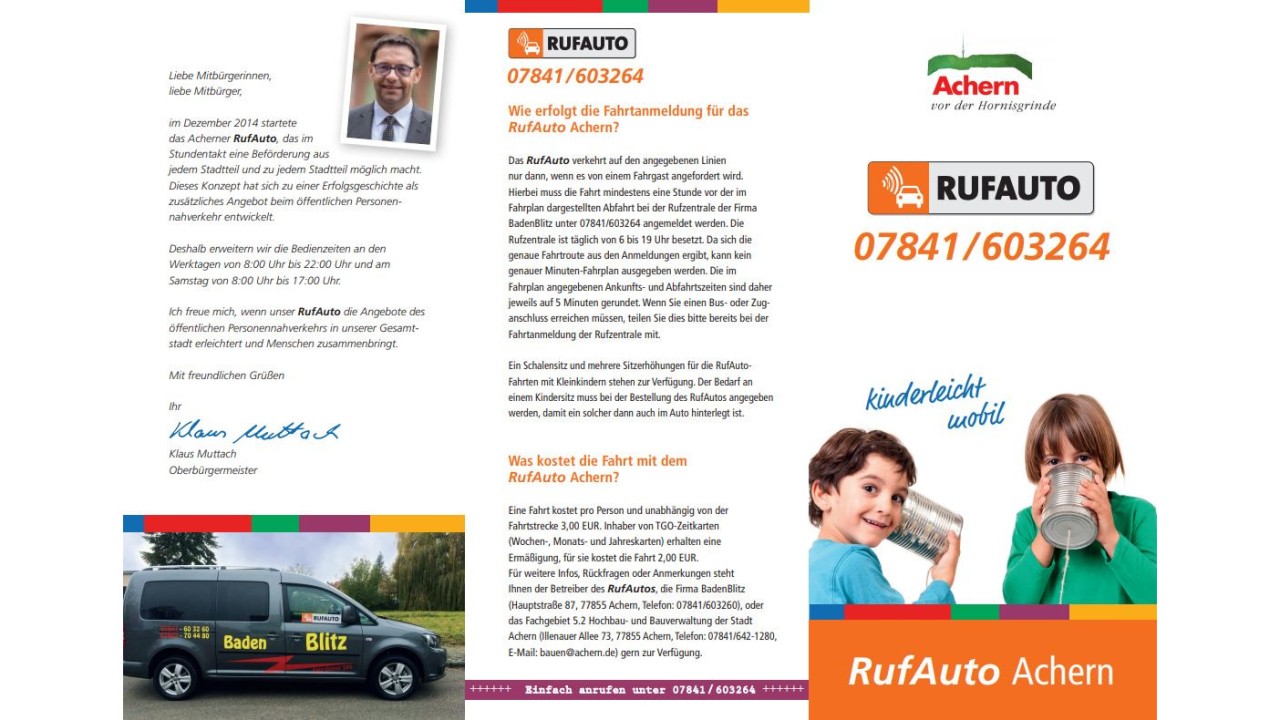 Die Stadt Achern beispielsweise hat im Rahmen eines vom Innovationsfonds unterstützten Projektes als erste Mittelstadt ein Mobilitätskonzept entwickelt, um im Sinne der Verkehrsvermeidung den Individualverkehr zu verringern. Dafür wurde zum einen das „Rufauto“ eingeführt, das im Gegensatz zu einem Linienbus nur dann fährt, wenn direkte Nachfrage besteht. Im Vergleich zu Linienbussen fallen somit sowohl Kosten als auch Umweltbelastung durch Vermeidung von Leerfahrten geringer aus. Mithilfe des neuen Konzepts und der daraus resultierenden optimierten Verknüpfung zwischen Individualverkehr und öffentlichem Personennahverkehr (ÖPNV) konnte Achern die Attraktivität der ländlichen Bezirke steigern und gleichzeitig ein gutes Vorbild in Hinblick auf nachhaltige Mobilität abgeben.