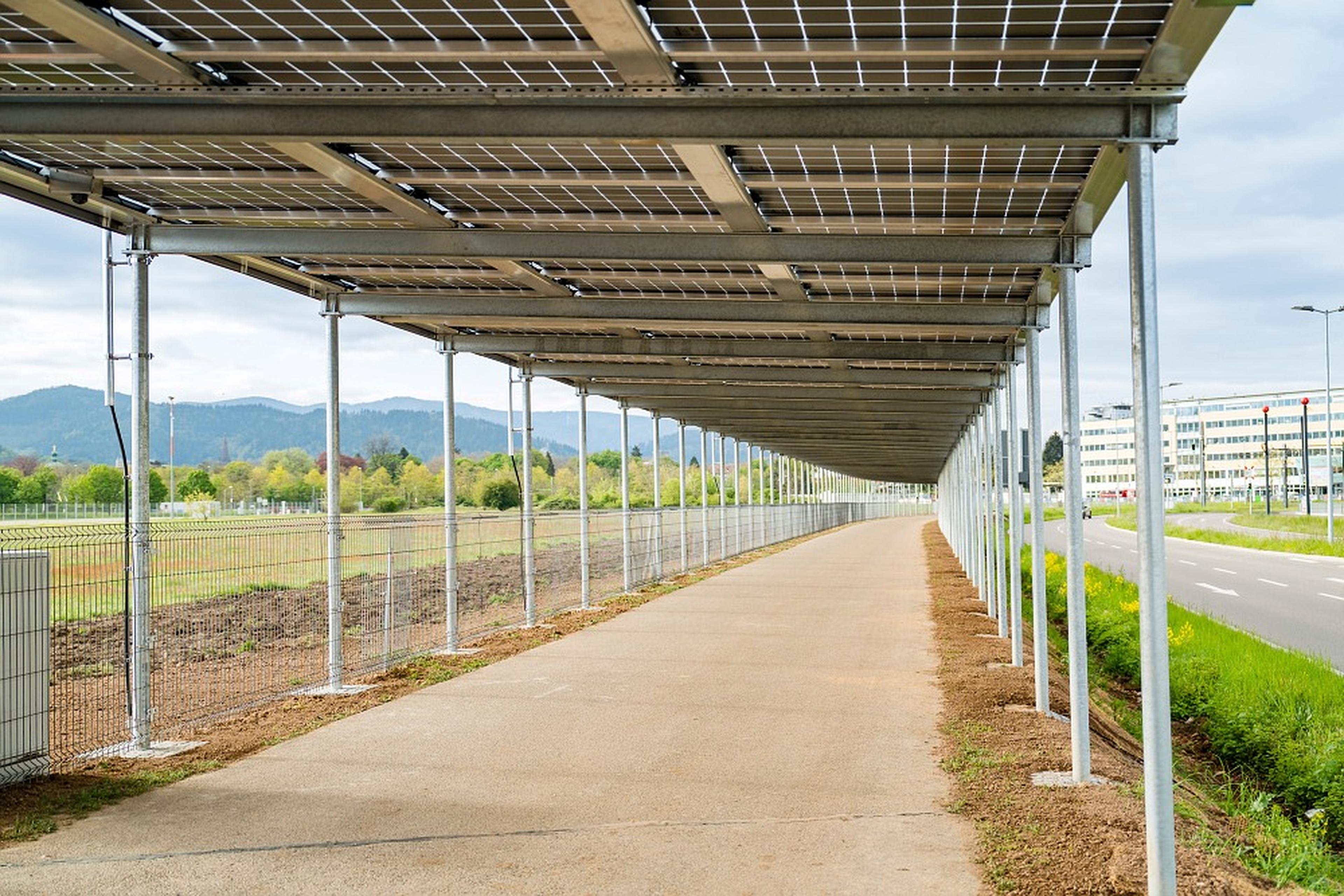 Im Freiburger Stadtteil Brühl-Beurbarung wurde zum Jahreswechsel 2022/2023 der Radweg entlang des Messegeländes mit einer Konstruktion aus Photovoltaikelementen überdacht.