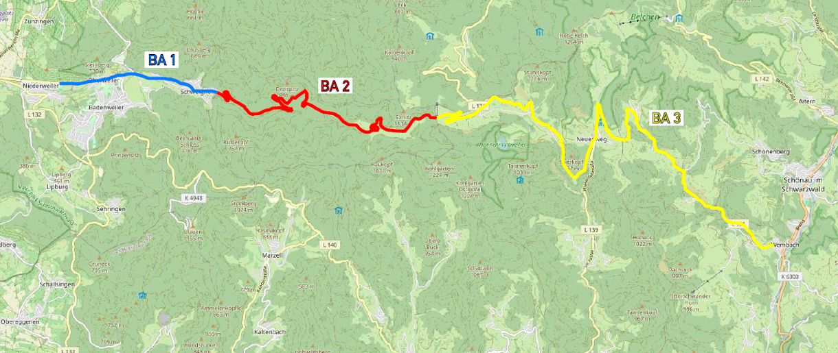 Die Arbeiten innerhalb des Windparks Sirnitz/Dreispitz bei Müllheim gehen stetig voran. Im Sommer 2026 sollen die Rotorblätter für die Windenergieanlagen von der Umladefläche in Müllheim-Niederweiler mit einem Spezialfahrzeug zum Windpark gefahren werden. Die Transportroute folgt der L131 vom Sportplatz Niederweiler bis zum Wanderparkplatz am Kreuzweg. Die hierfür notwendigen Vorarbeiten erfolgen in Abschnitten: