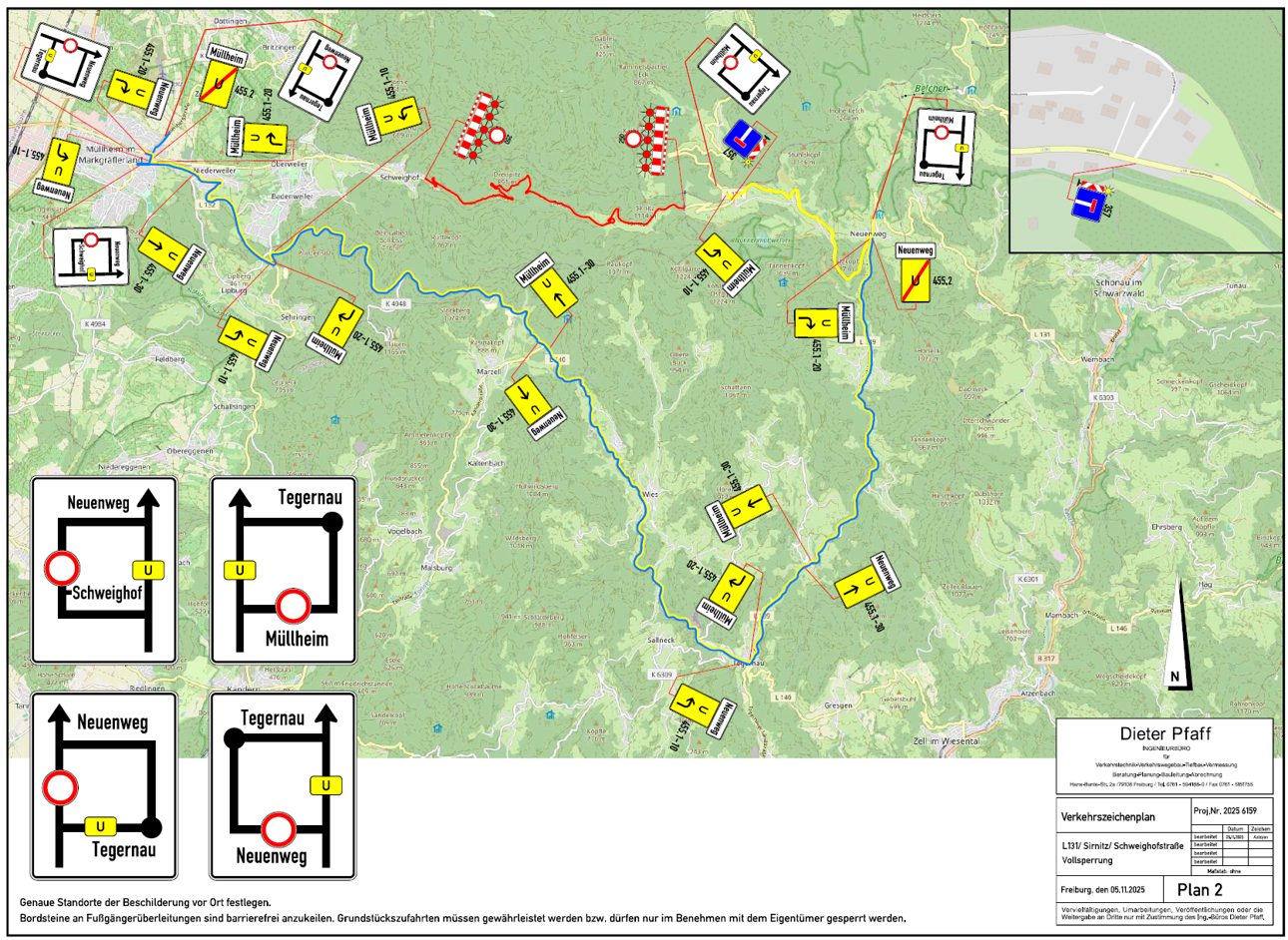 Vom 12.01. – 30.01.2026 werden dann Arbeiten im restlichen Abschnitt entlang der L131 von der Forellenzucht bis zum Windpark durchgeführt. Neben den Arbeiten an den Bäumen werden in einigen Kurven auch Straßenbauarbeiten durchgeführt, weshalb die Straße komplett gesperrt und eine Umleitung über Tegernau eingerichtet wird (siehe Plan).